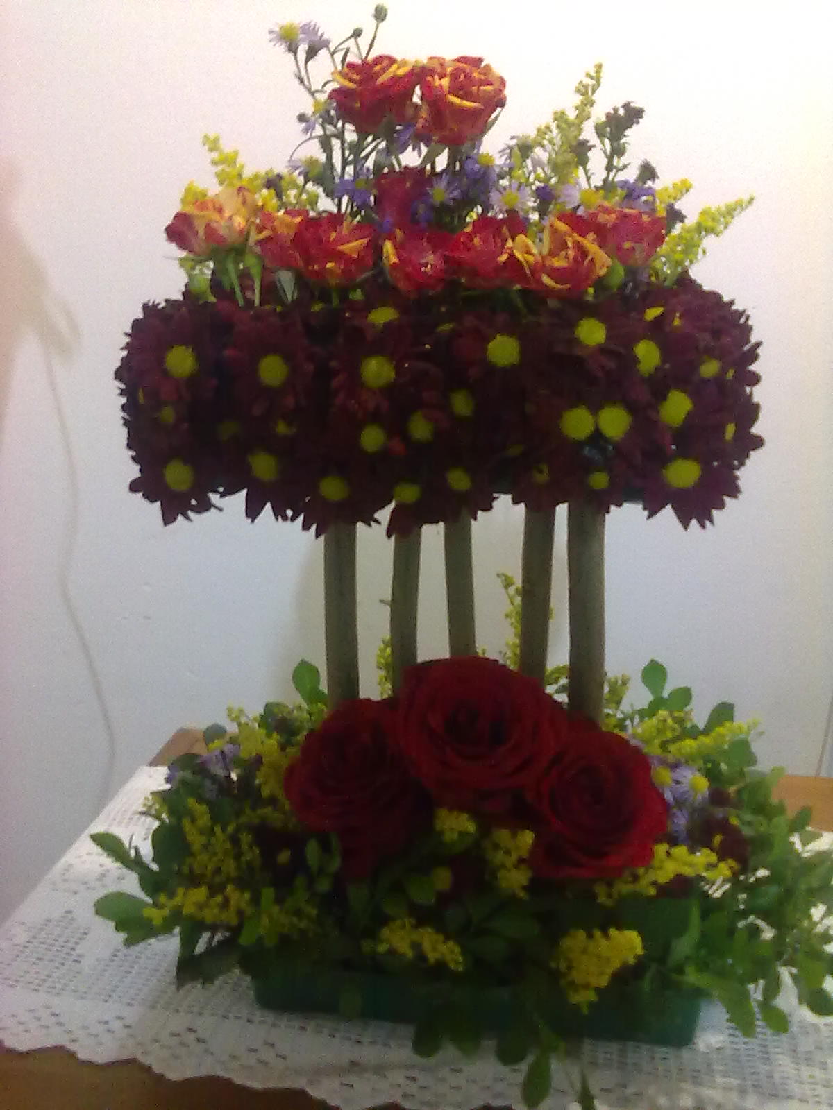 Este arranjo foi feito pela irmã Adenildes ela o fez em um vaso de espelho colocou o floral em hastes de papyros uma mais alta que a outra que estão presas em outro floral inteiro que esta no vaso envolveu os florais de cima em filme plastico e colocou as flores abrindo buraquinhos com palito de dente para abrir o plastico em direção de cada haste colocou rosas nicolly e biance e na outra colocou astromelias e 3gerberas nos dois florais de cima foi posto olho de gato lilas e lisiantus roxo com branco e miozoti e uma folha larga que eu esqueci o nome... rsrs para a cerquinha de traz ela colocou os papyors enfiados em um arame grosso e na ponta que ficou sem papyro em colcou um pedaço de papyro em pé e fixou no floral... ficou lindooooooooooooooooooooooooooooooooooooooooooooo!!!! Todos da igreja amaram falaram que foi "O ARRANJO"!!! rsrs começou o ano bem hein irmã Adenildes!!!